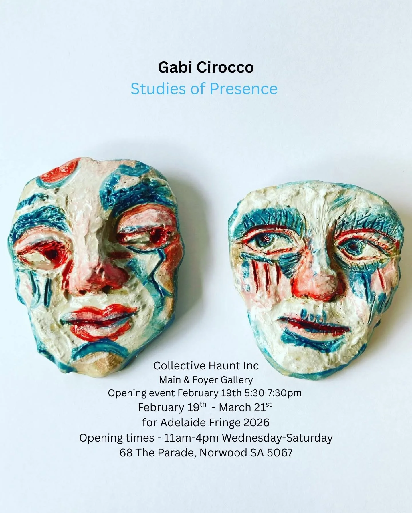 A exhibition by Adelaide artist Gabi Cirocco, featuring a series of works from her studio practice. The exhibition brings together oil paintings, drawings, watercolours, and sculptural pieces that each explore moments of stillness, memory, and human connection. Her practice draws on her Australian and Italian heritage, weaving together themes of cultural identity. In this body of work, she explores the presence of loss and life as integral parts of the human experience via a repeated motif of expressions of human emotion in portraiture. The works aim to reflect an intimate dialogue between materiality, memory, and mindfulness, capturing the quiet gestures that connect us to one another and to our inner worlds.
